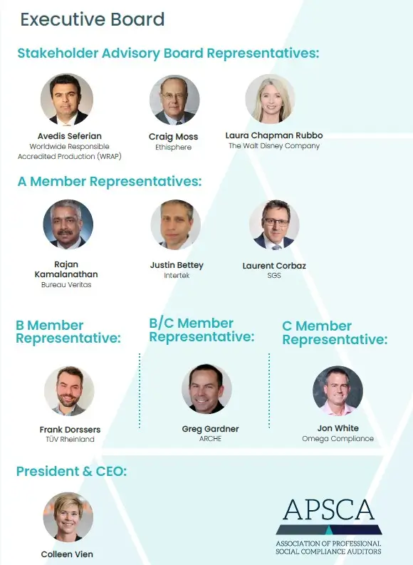 APSCA执行委员会主席(董事会主席):Avedis Seferian——WRAP(全球负责任生产认证)的总裁兼首席执行官,他会讲5国语言,有3个国家的学士/博士学位,是美国律师协会的会员。