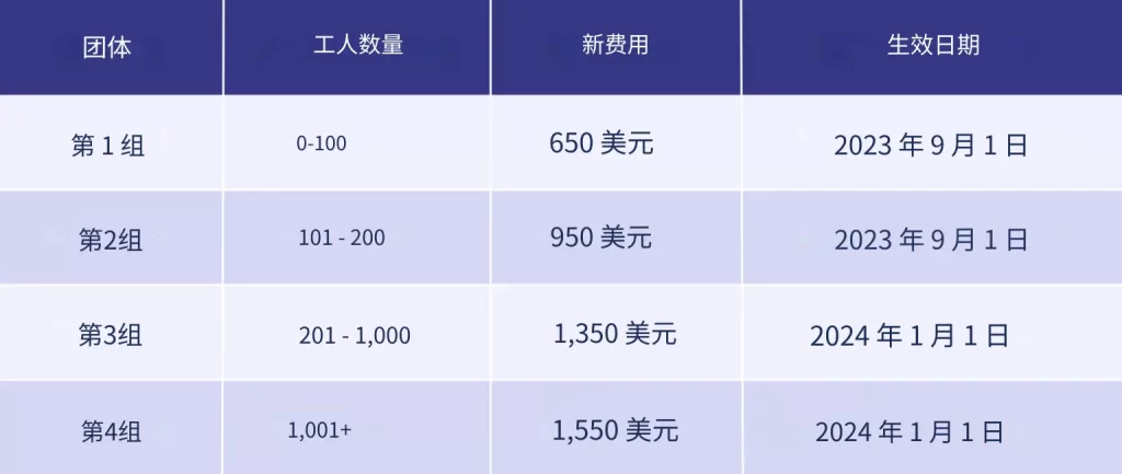 WRAP注册费在2023年底进行过一次大的调整,对小型工厂降低了注册费,对大型工厂提高了注册费。目前WRAP注册费表格如下: