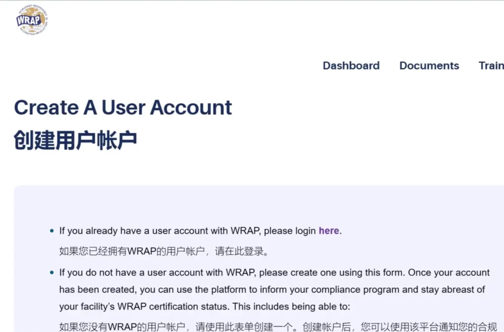 - 如果是初次申请WRAP验厂,需要在WRAP官网上注册账户:创建用户帐户 — Create a User Account (wrapcompliance.org)