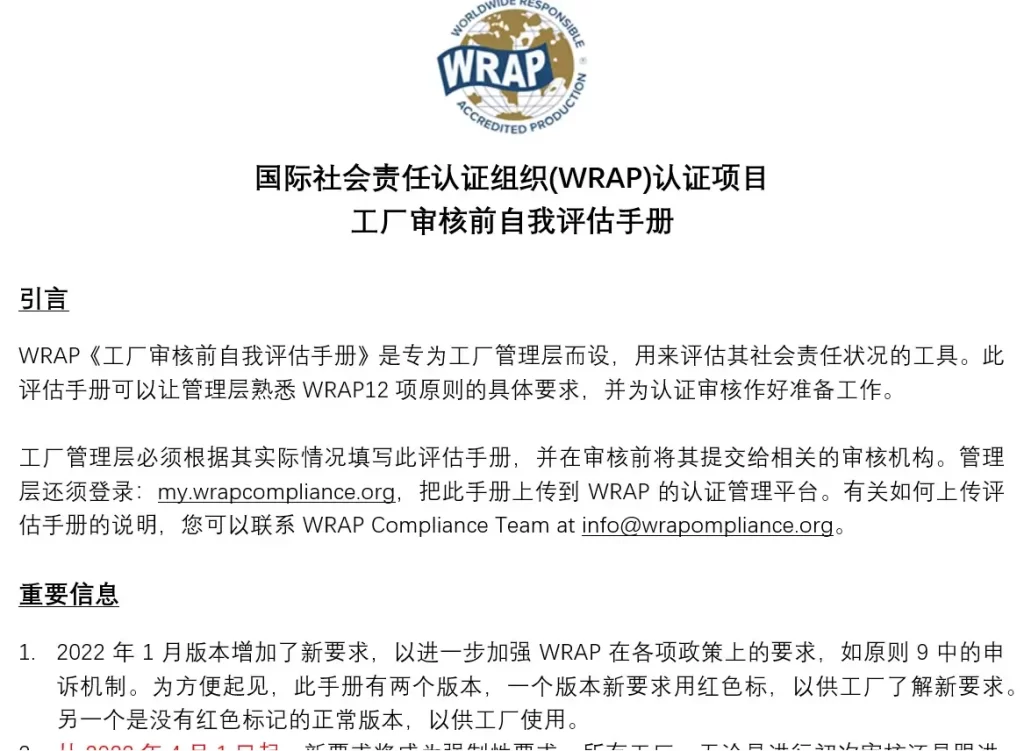 在进行WRAP验厂之前,工厂可以使用WRAP的自我评估手册(PASA),来自我检查。WRAP自我评估手册,实际上是WRAP验厂的检查清单,它包括审核公司将要查阅的检查点,以及编制相关文件、信息和资源的指导。